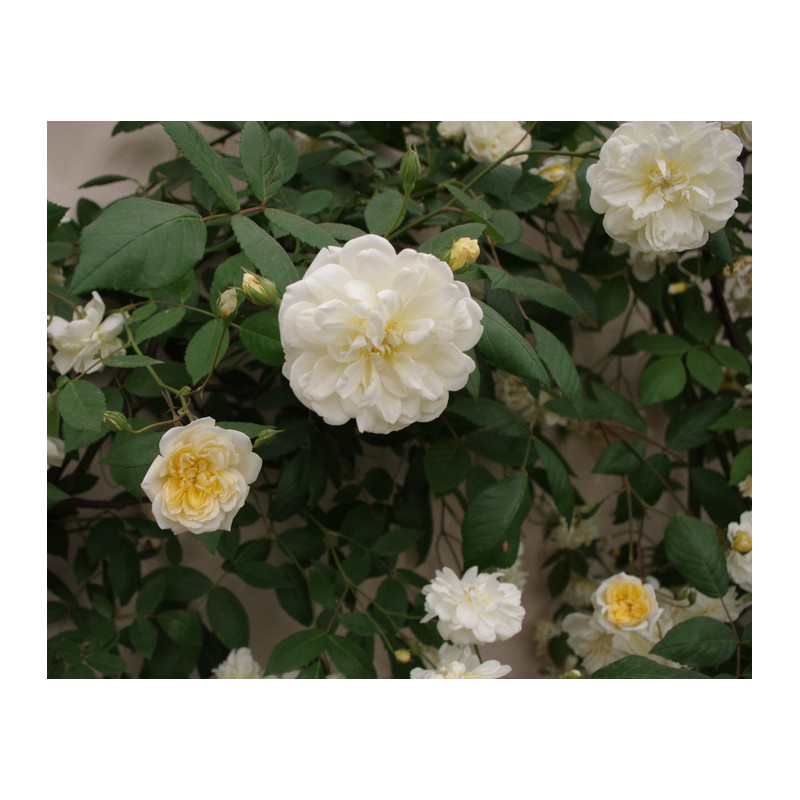 Ses grappes de fleurs son ravissantes, évoquant un peu les rosiers de Noisette: de petites fleurs bien doubles, en rosette, sur des grappes lâches. Le coloris évolue du jaune en bouton et à l'ouverture pour passer rapidement au crème puis franchement blanc.