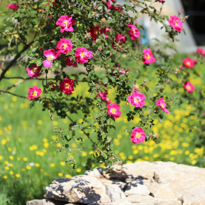 Eglantines hésitant entre le rose magenta et le rose indien, au belles étamines dorées, suivie de nombreux fruits orangés.