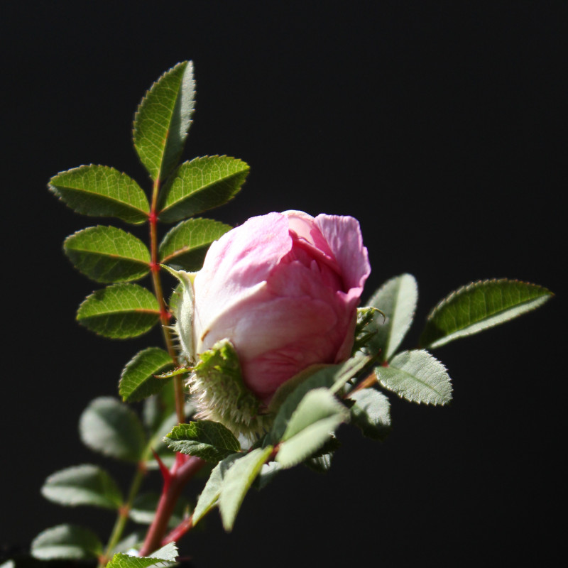 Rosa roxburghii 'Plena'Arbuste remarquable en tous points. Magnifique végétation au feuillage fin, écorce claire se desquamant, fleurs très pleines, du rose violacé au rose moyen.