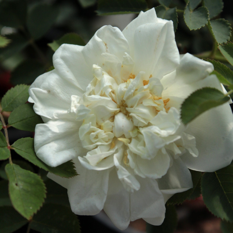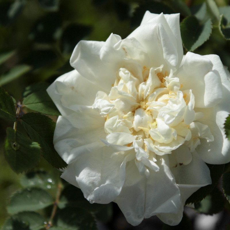 Des fleurs merveilleusement formées, évoquant les roses anciennes, ouvertes à plat avec un oeil presque en bouton, blanc crème, sont disposées sur toute la longueur des branches comme chez les rosiers pimprenelles (Rosa spinosissima) donnant l'impression d'un rosier couvert de neige.