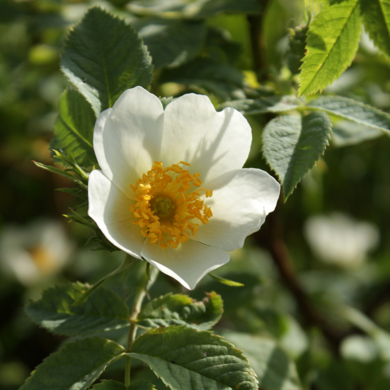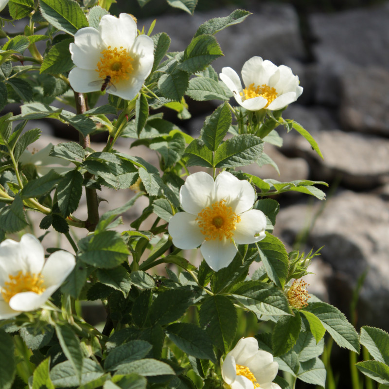 Arbuste vigoureux, à la croissance similaire à celle de l'églantier (Rosa canina), doté d'un très beau feuillage ample et abondant, vert clair grisé et duveteux sur sa face inférieure.