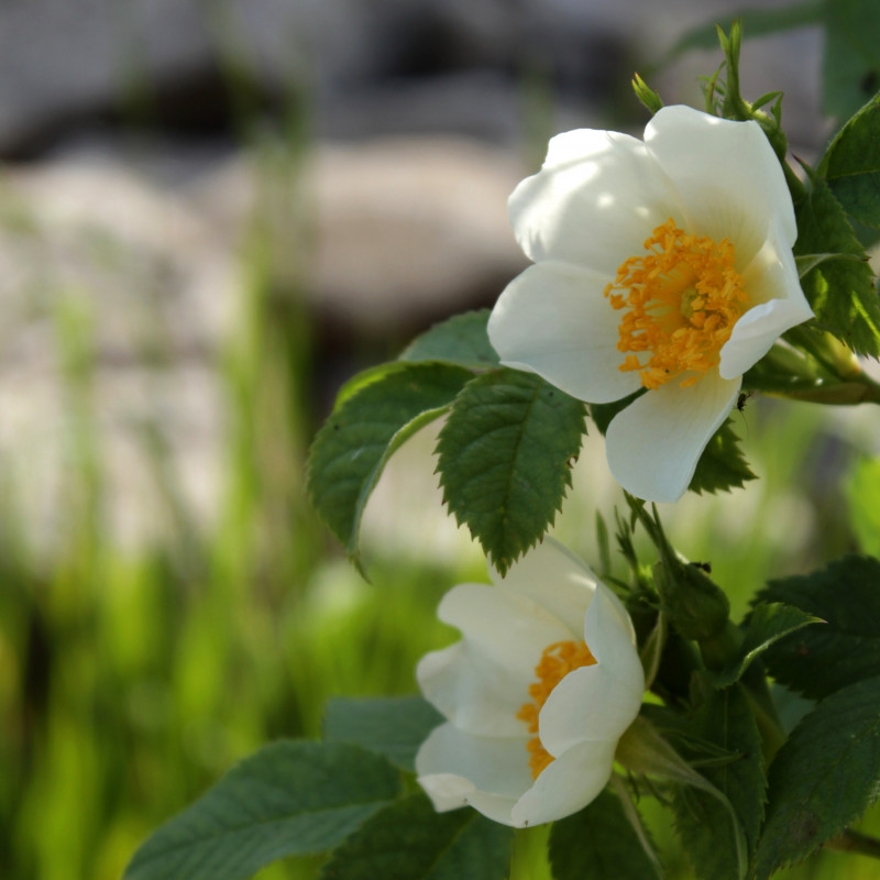 Les roses sont produites en bouquets de coupes blanches dont l'abondance d'étamines, formant une couronne jaune or en son centre, contraste admirablement avec ce blanc de lait des pétales en forme de coeur.