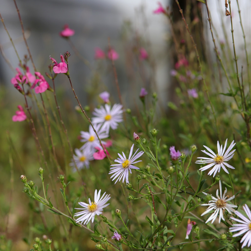 Son port est élégant, arqué, et ses fleurs d'une grandes délicatesse, avec ses ligules (les "pétales") bien distancées les unes des autres comme des étoiles du plus mauve rosé. Les fleurs sont assez grandes pour un aster.